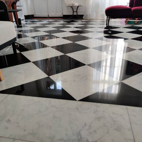 remise en état de son sol en marbre blanc et noir.Une cristallisation du marbre a alors été réalisée par M.Briche afin de redonner aux carreaux de marbre en damier de la brillance.