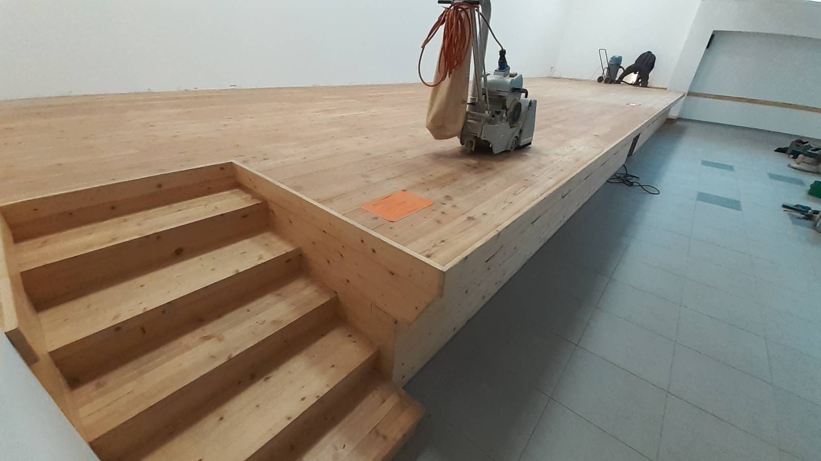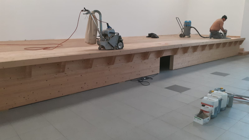 Une première phase de ponçage à la machine à bande avec aspiration directe, puis un ponçage manuel des marches et des bordures a permis d'éliminer les traces de vitrification ainsi que les traces de passage de la scène.