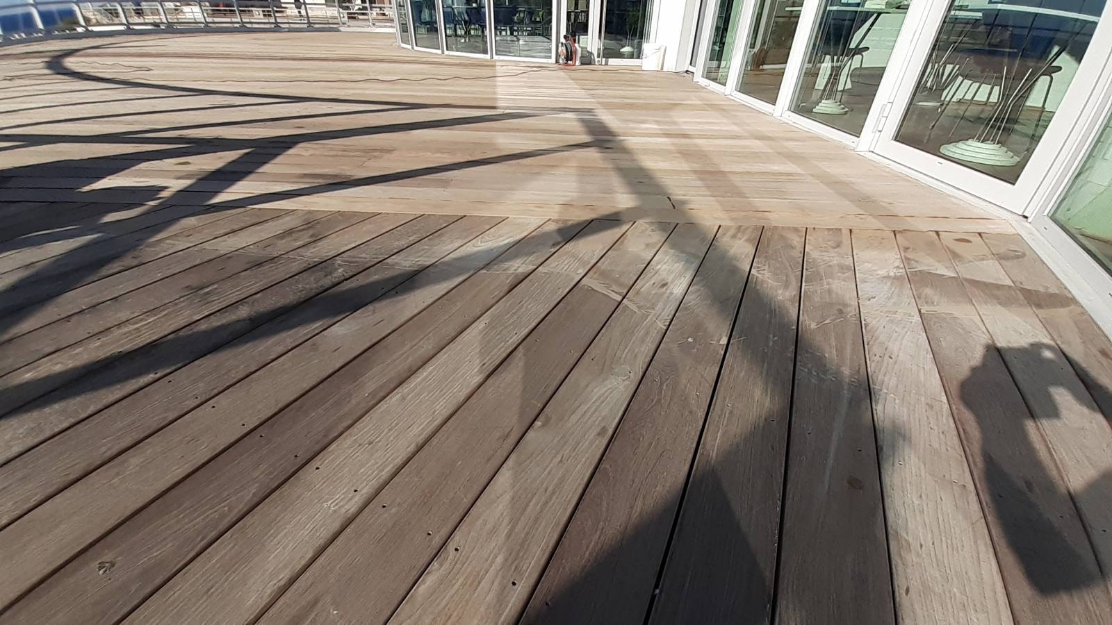 Après une intervention de ponçage à la machine à bande à aspiration directe pour retirer les couches superficielles de vernis, et redonner au bois son aspect d'origine, M.Briche a ensuite réalisé un traitement spécifique pour les bois exposé aux vents marins.