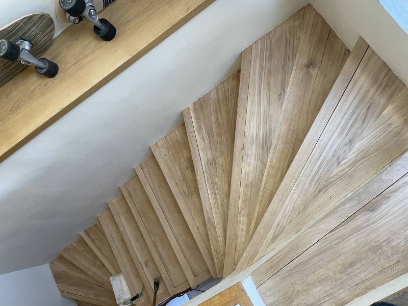 Afin de remettre en état cet escalier, JB Briche a effectuée un première phase de ponçage de manière manuelle, permettant ainsi de poncer les bords, les angles ainsi que l'ensemble des marches. Cette étape redonne au bois son aspect d'origine en enlevant les traces superficielles d'usure liées au passage.