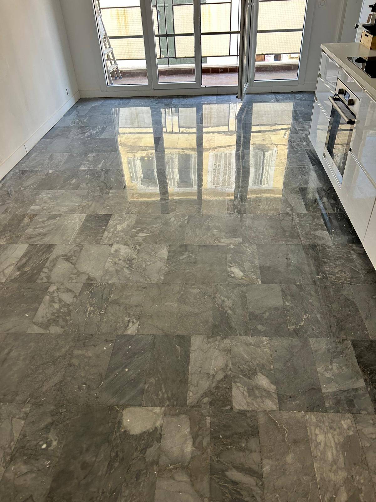 La rénovation a débuté par un ponçage précis destiné à retirer les traces du temps et les anciennes couches de vernis. Chaque lame de parquet a été soigneusement restaurée, en respectant le motif emblématique des bâtons rompus, afin de révéler la noblesse naturelle du chêne massif. Pour sublimer le veinage et protéger durablement la surface, nous avons appliqué un vernis naturel Pallmann, reconnu pour sa résistance et sa finition haut de gamme.