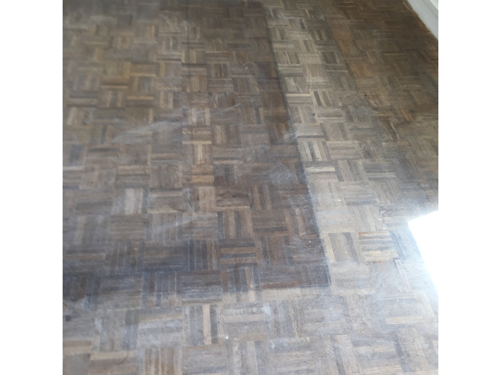 Puis une mise en vitrification a permis de redonner toute la brillance à ce parquet mosaïque chêne et de choisir la teinte qui correspond le mieux aux attentes des clients.