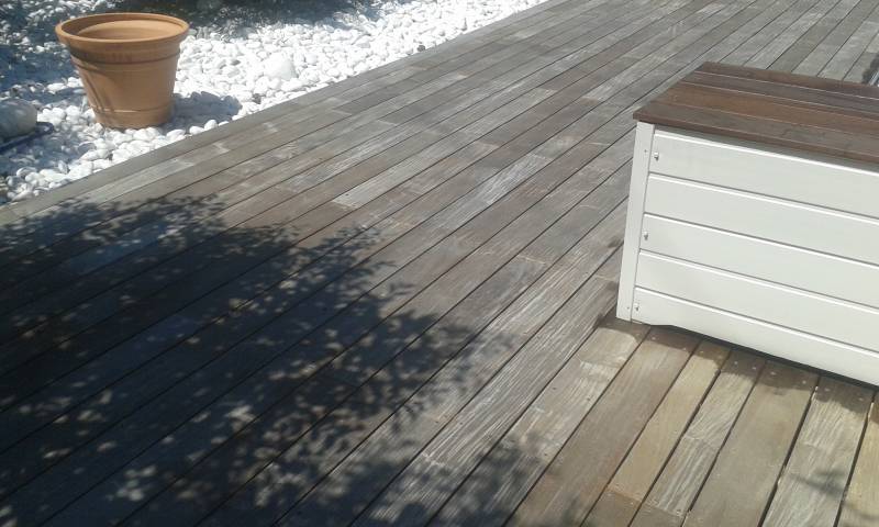 Après une première phase de ponçage, un produit spécifique dégriseur est appliqué afin d’enlever cette couleur grise au bois. Enfin, l’application d’une huile en deux couches permet de redonner au bois sa couleur d’origine et de lui apporter de la brillance.