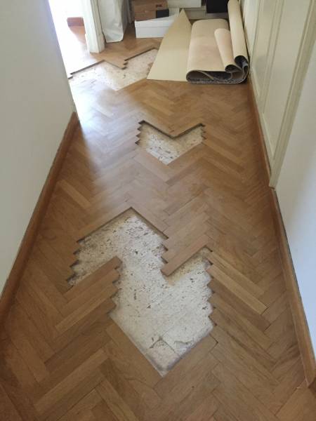 lames de bois du parquet en pose chevron étant très endommagées, M.Briche a tout d'abord effectué le