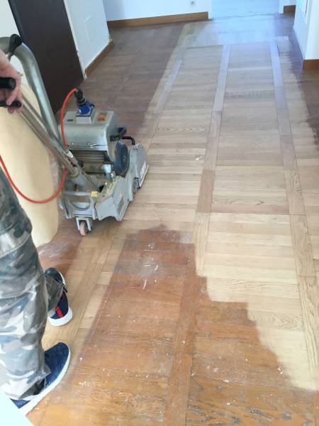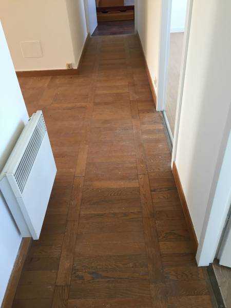 Après une phase de dégrossissage consistant au ponçage de la totalité de la superficie du parquet, nos artisans ont pu redonner au parquet son aspect d’origine.