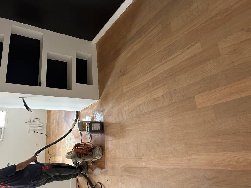 La spécificité de ce chantier résidait dans le ponçage, nécessaire pour redonner au parquet sa brillance naturelle. Nos artisans ont travaillé durant les heures où les occupants étaient absents afin de ne pas les déranger.
