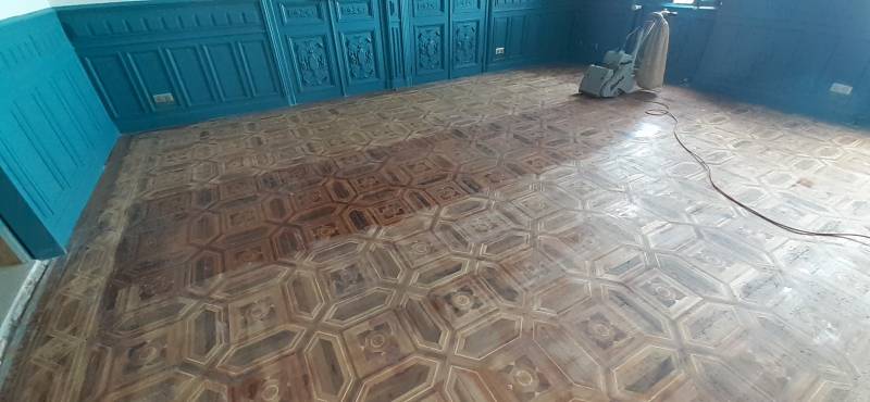 En véritable artisan du sol, M.Briche rénove les parquets massifs très anciens constitués de différentes essences de bois.