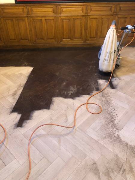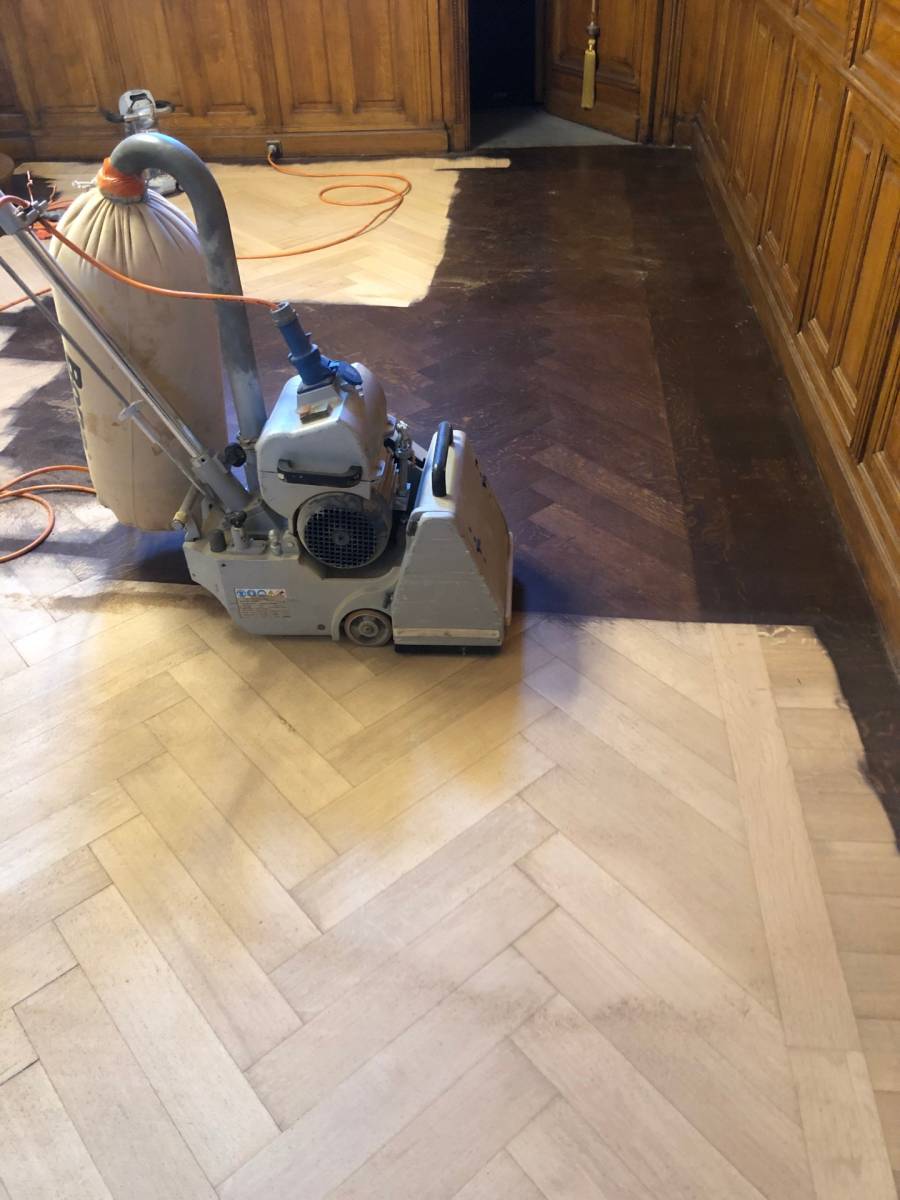 Une fois la surface poncée, la couleur d'origine du bois apparait sur ce parquet en pose chevron.