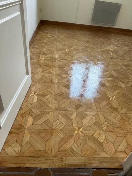 Notre intervention a débuté par un ponçage soigné visant à éliminer les irrégularités et les couches de vernis vieillissantes. Chaque détail du parquet en chêne massif a été restauré avec minutie, afin de préserver la beauté unique du motif ancien. Ce travail de précision a permis de retrouver la texture noble et authentique du bois avant d'appliquer une finition naturelle. Nous avons sélectionné un vernis haut de gamme Pallmann, spécifiquement adapté aux parquets en chêne massif, afin de sublimer le veinage du bois tout en garantissant une protection durable contre l’usure quotidienne.