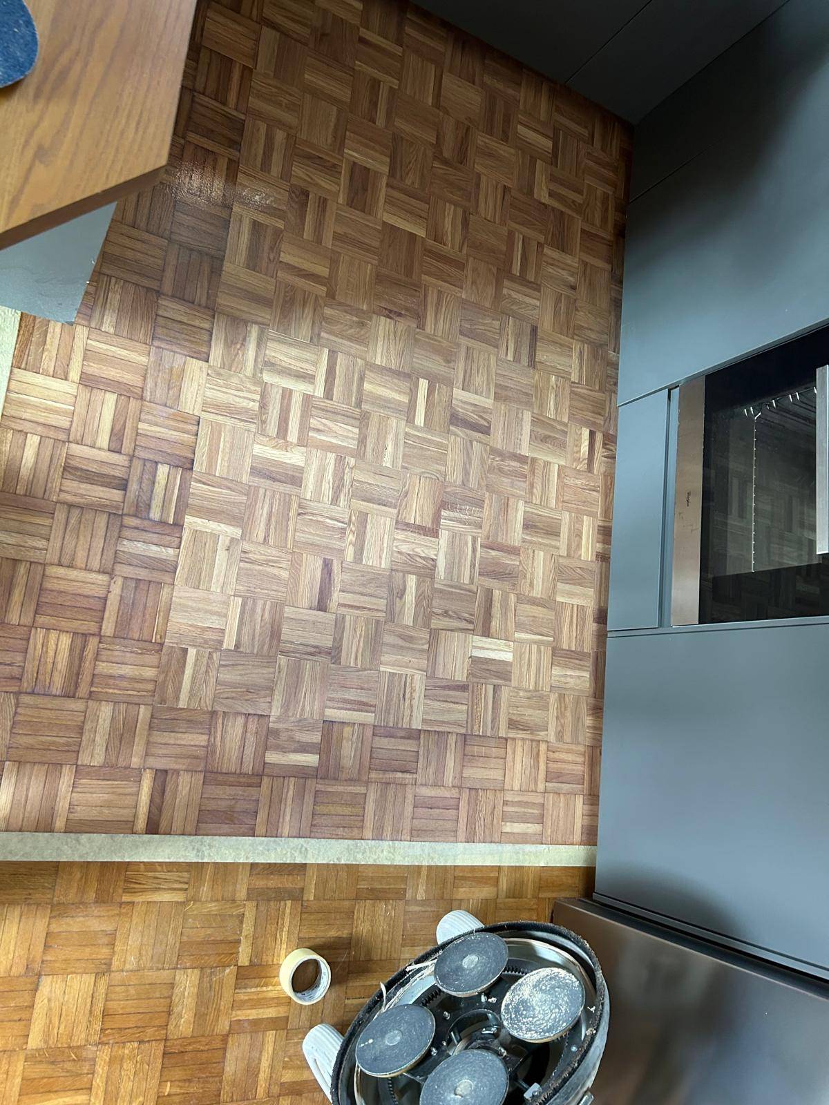 Rénovation d’un parquet chêne mosaïque à Aix-les-Milles : réparation soignée après dégât des eaux, ponçage profond et finition durable avec teinte proche de l’original. Expertise de 15 ans.